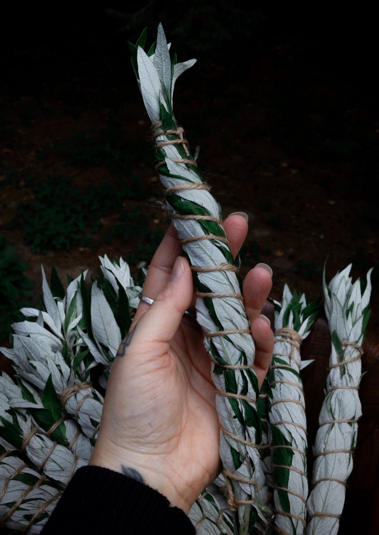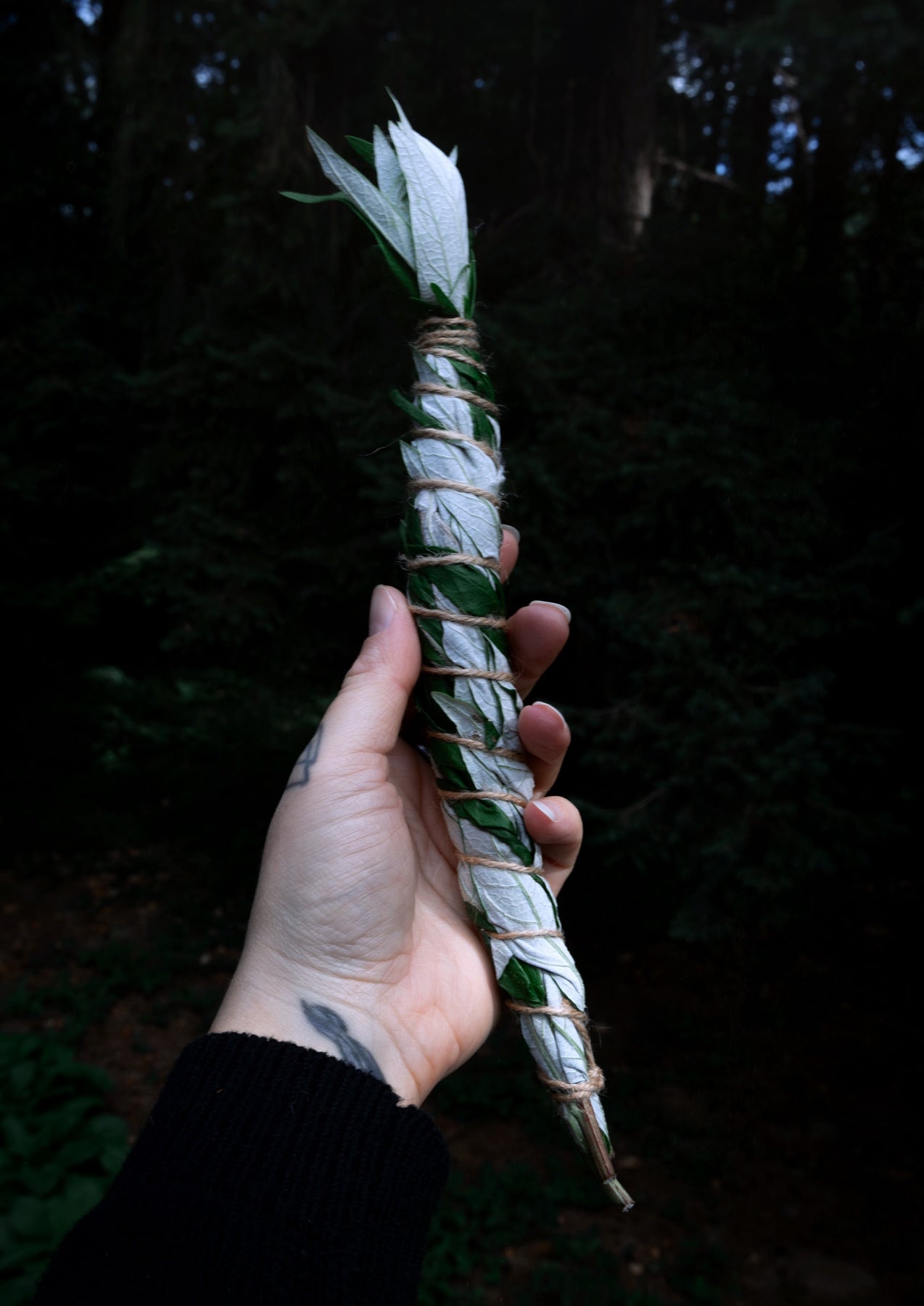 **Safety Disclaimer: Please be careful when burning these Wands. Once lit, wave back and forth so there is no flame and it is smoking. The plant material has been left to dry so that they can burn nicely, but this means there is a chance small pieces can come off of them as they are burned. You can stamp it out into a plate or bit of water, or wave back and forth. Please take precaution and do not leave unattended.