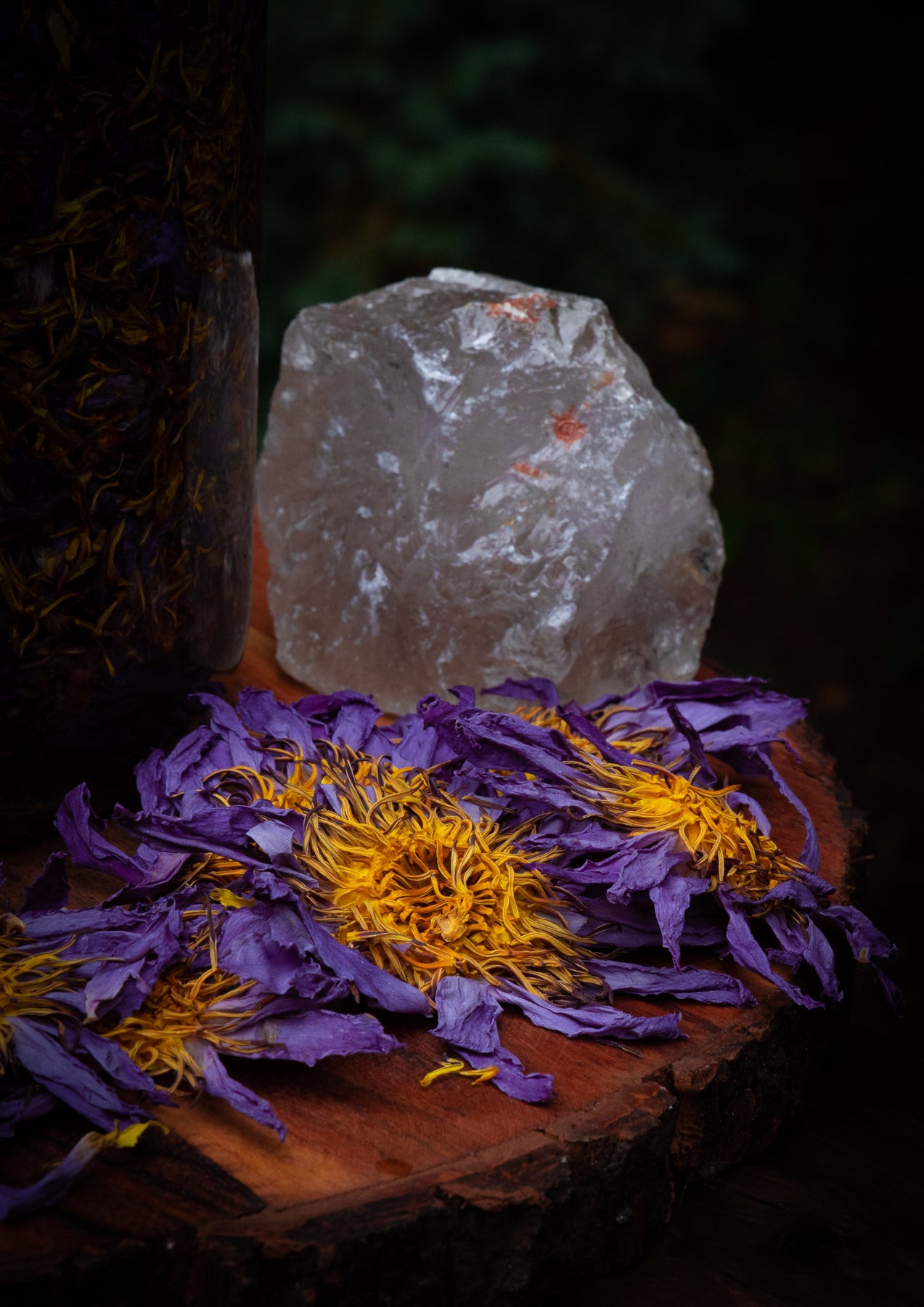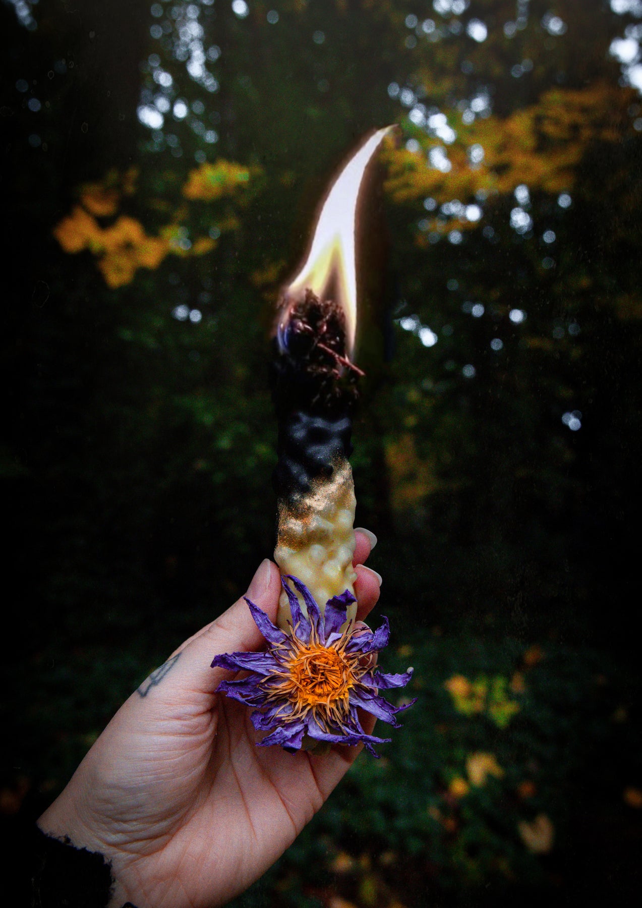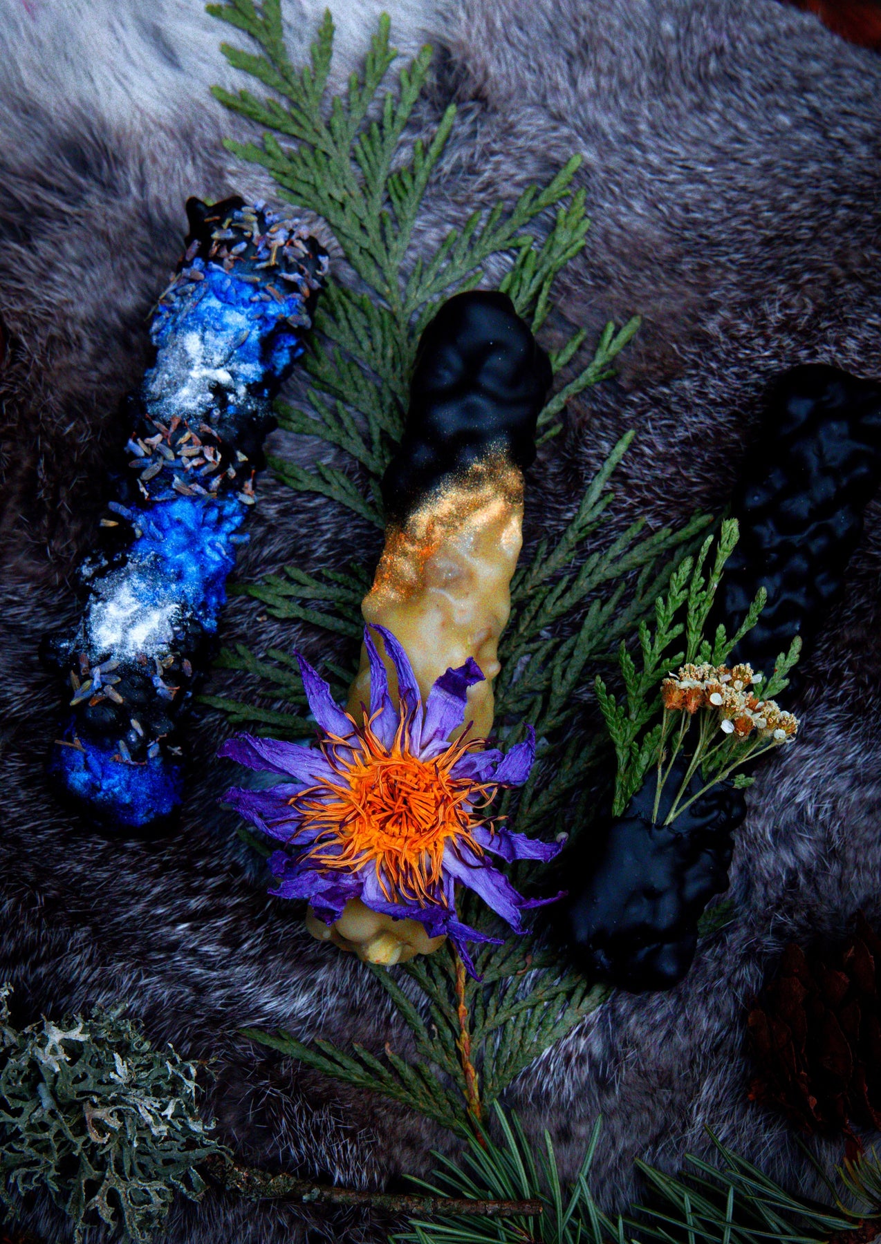 These are the "Inner Ceremony Taper" - crafted with natural PNW beeswax as well as charcoal infused PNW beeswax, garnished with a Blue Lotus blossom and natural gold mica minerals. This taper is intended to conjure a ceremony within. Blue Lotus is revered as an aphrodisiac, as well as the flower of inner peace, love, tranquility and intuition.
