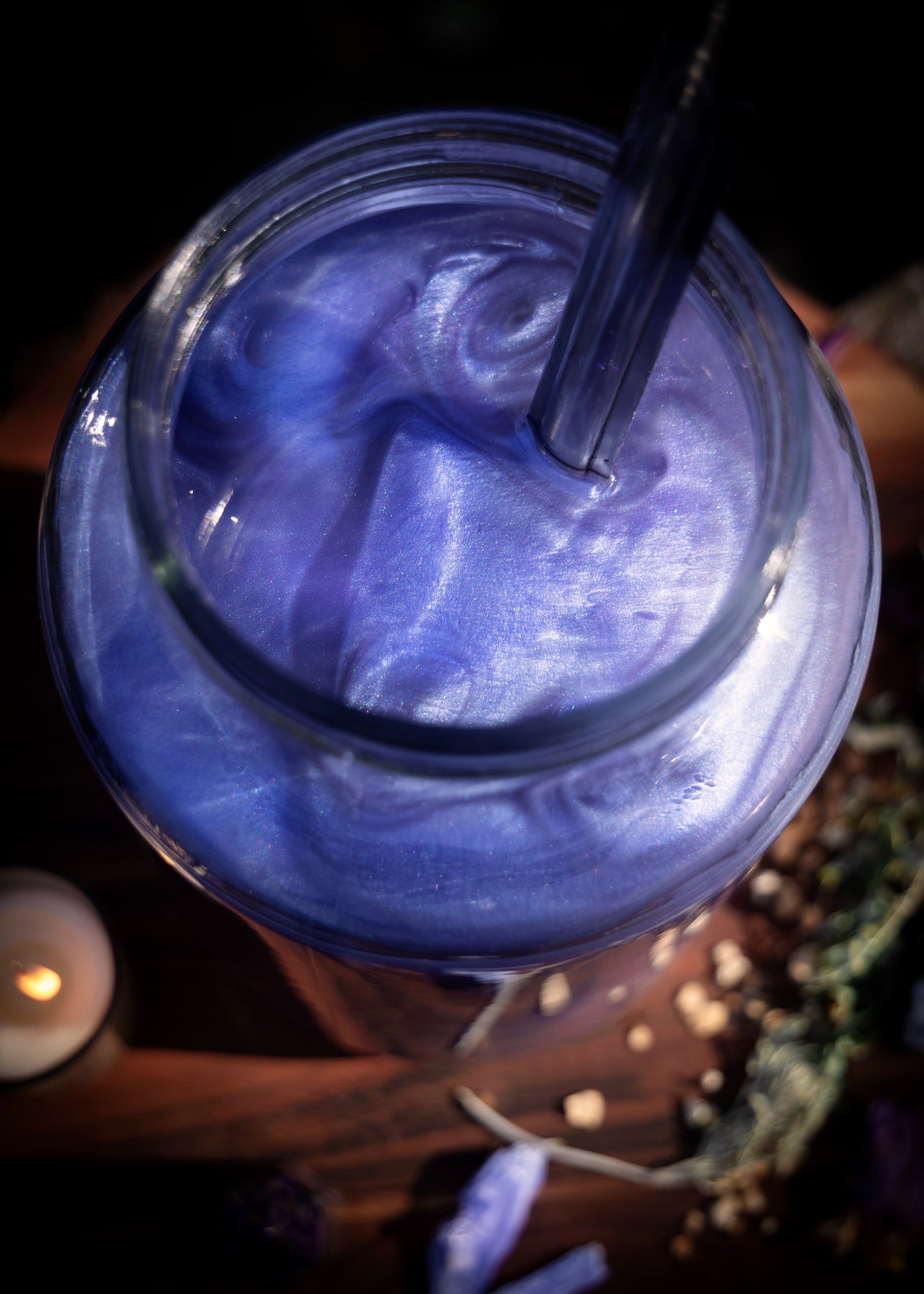 Infused with essences of: Blue Kyanite and Charoite, Mistwalker echos their iridescent purple-blue hues, and frequencies of clarity, transmutation, and psychic awakening. A touch of natural mica truly brings all these shimmering energies to life.