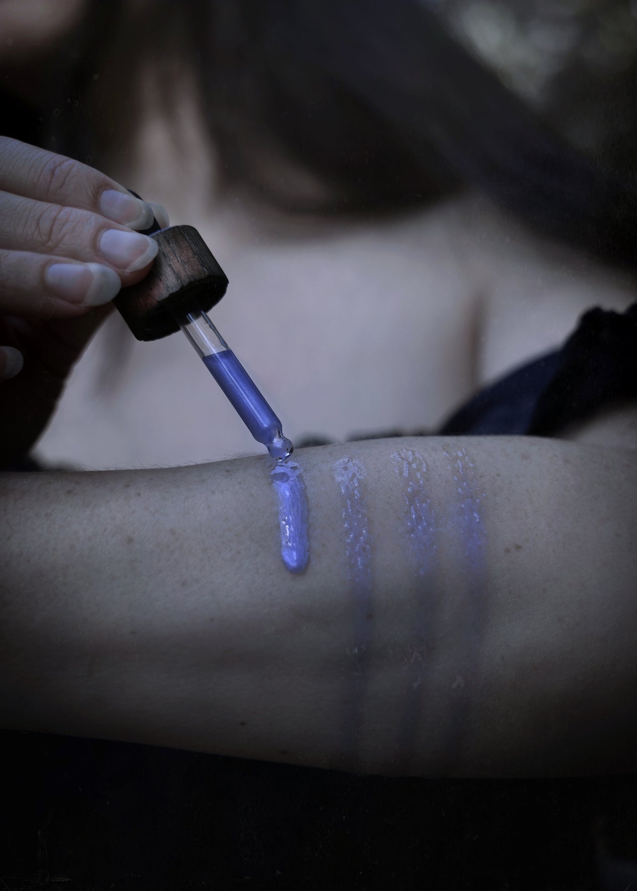 Organic Oils & Herbs: Mugwort, Labdanum, Angelica Root, Blue Tansy, Meadowfoam Seed, Squalane, Apricot Kernel, Abyssinian, Camellia Seed, Caprylic/Capric Triglyceride (MCT), Blue Kyanite Essence, Charoite Essence, Natural Mineral MICA