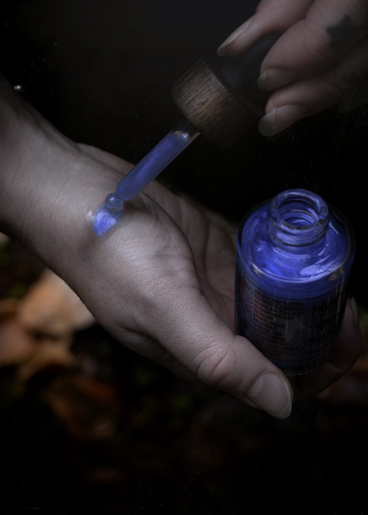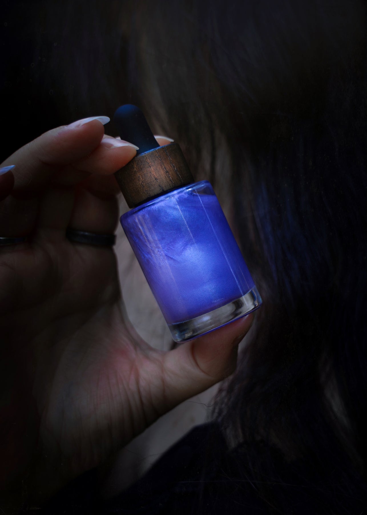 Mistwalker is an intentionally crafted shimmer oil and ritual serum ~ an alchemy of high quality lightweight oils infused with herbs, crystals and mineral crystalline mica which creates the shimmer. Designed to be worn on bare skin or mixed with lotion, she doesn't shed or sparkle, but leaves behind a soft, iridescent shimmery glow.