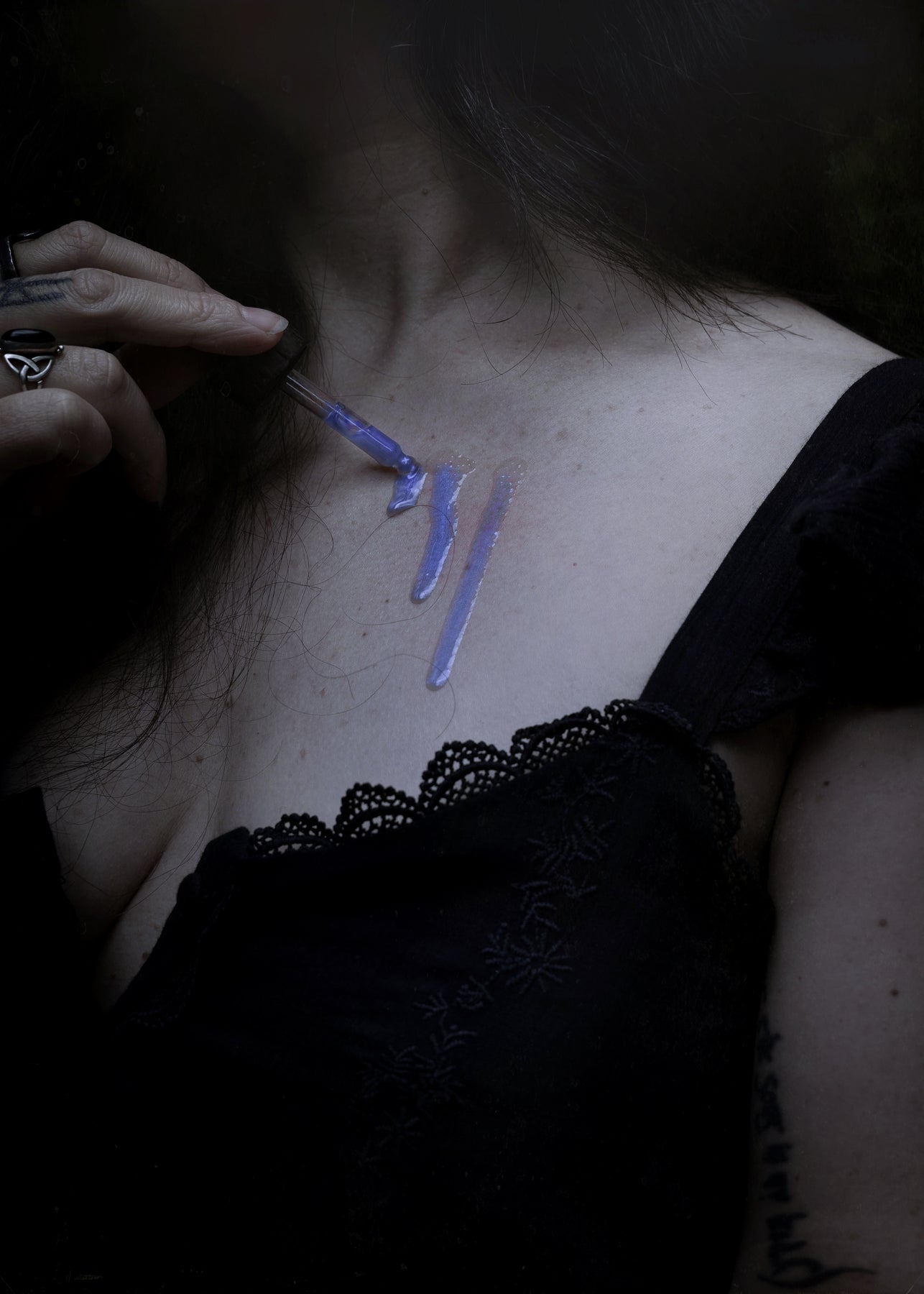 As a Third Eye & Shadow Serum, she allows us to embody both beauty and spirit. Massage between brows, into temples, wrists, chest, and chakra lines to awaken the third eye, deepen dream recall, and support shadow integration. An oil for both body and energetic field, she’s grounding, clarifying, a conduit to the mysteries of ocean, moon and the in-between spaces.