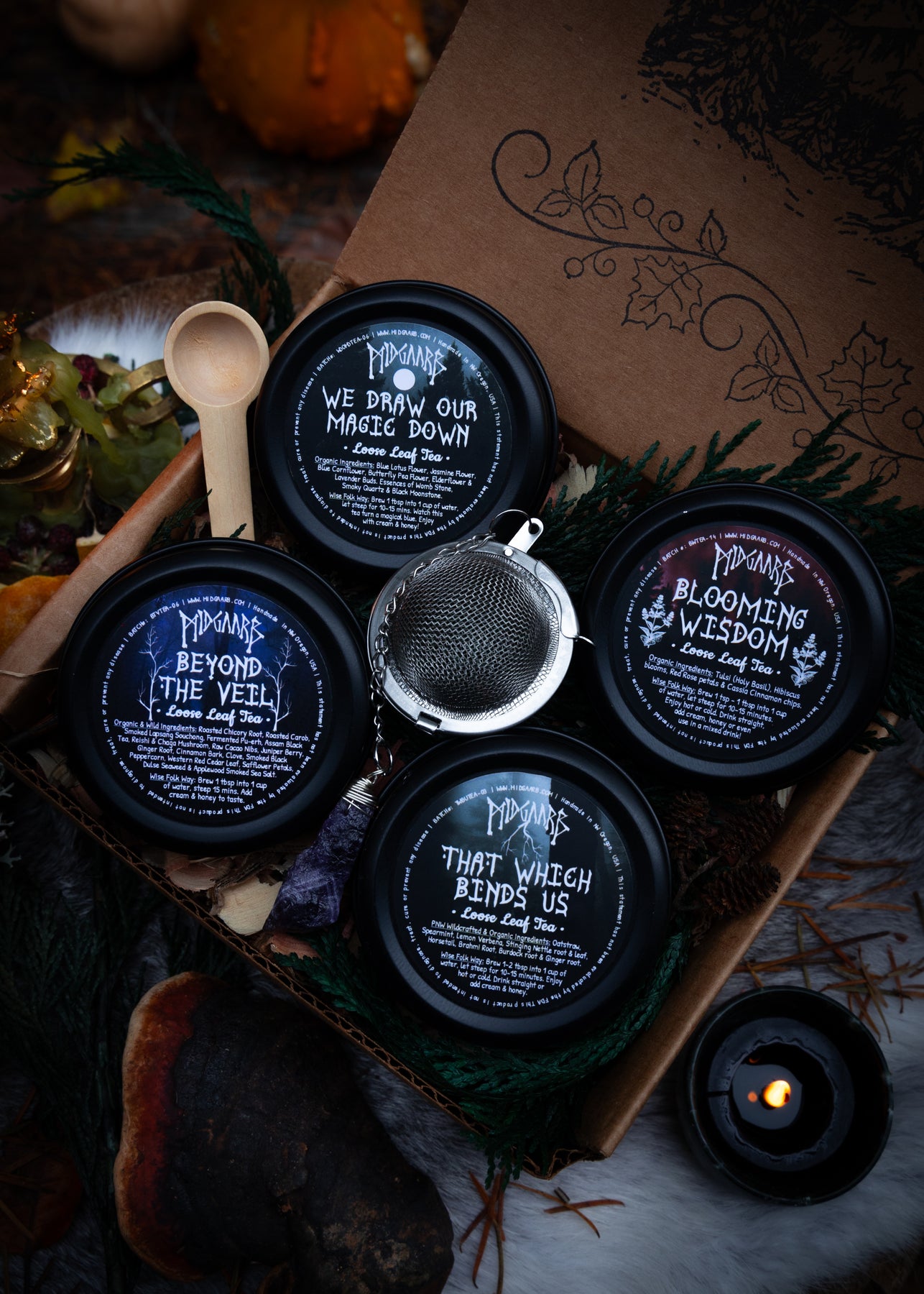 • TEA SAMPLER GIFTSET • Blooming Wisdom, Beyond the Veil, We Draw our Magic Down, That Which Binds Us & Amethyst Tea Infuser