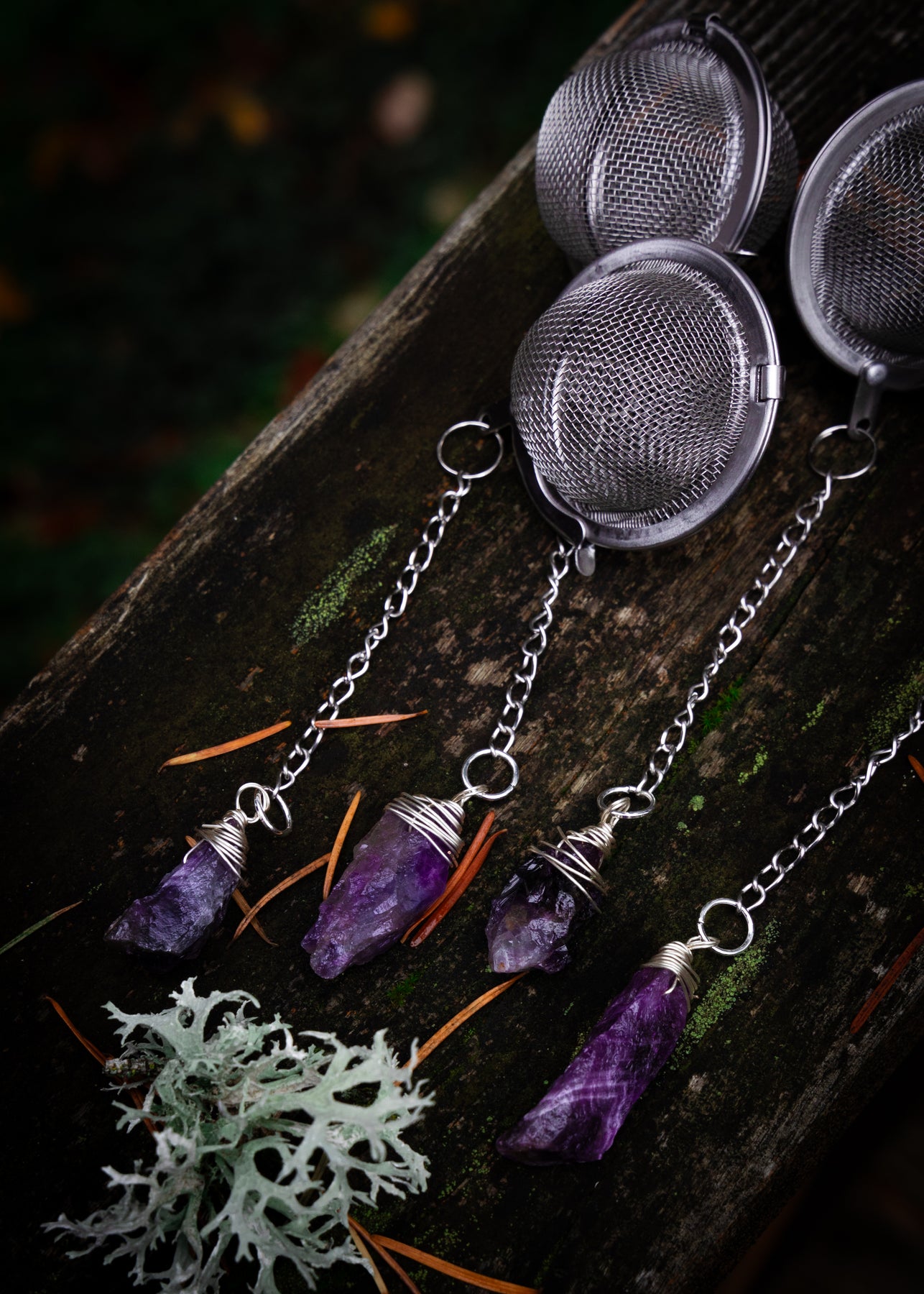 🌲 AMETHYST CRYSTAL TEA INFUSER ~ This adorable tea strainer is made of stainless steel, and features mesh holes throughout it allowing the tea to infuse into hot water. Pack this strainer with your tea and place it directly in your cup so you can enjoy a little crystal magic in your mug while your tea brews!