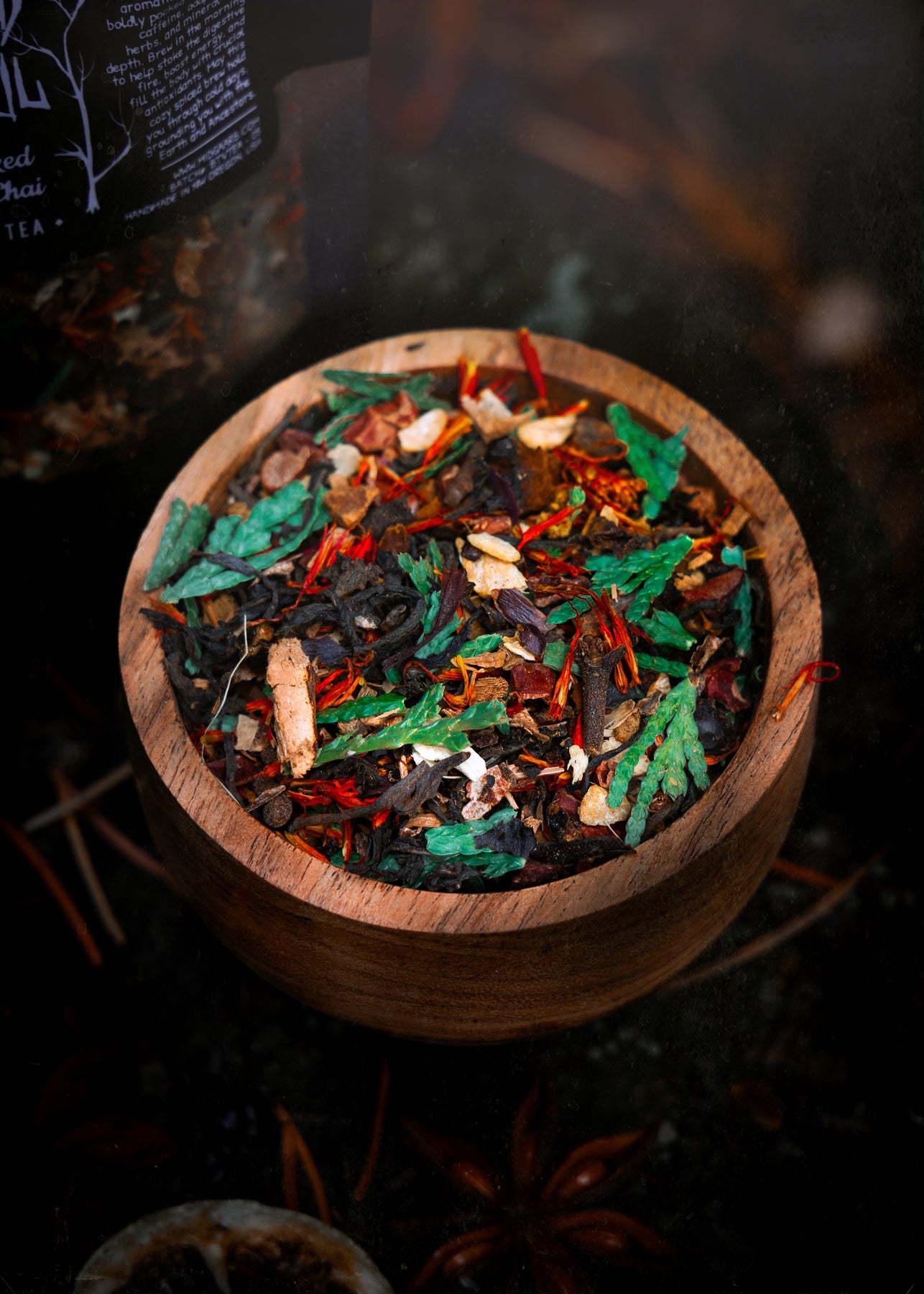 🌲 BEYOND THE VEIL ~ The only chai you will ever need. Packed with naturally caffeinated and energizing herbs, this decadent brew brings together smoked roots, ancient fermented teas, wild forest notes, earthy wild mushrooms, touch of umami seaweed, applewood smoked salt and aromatic chai spice 🍄 Click here for the full size