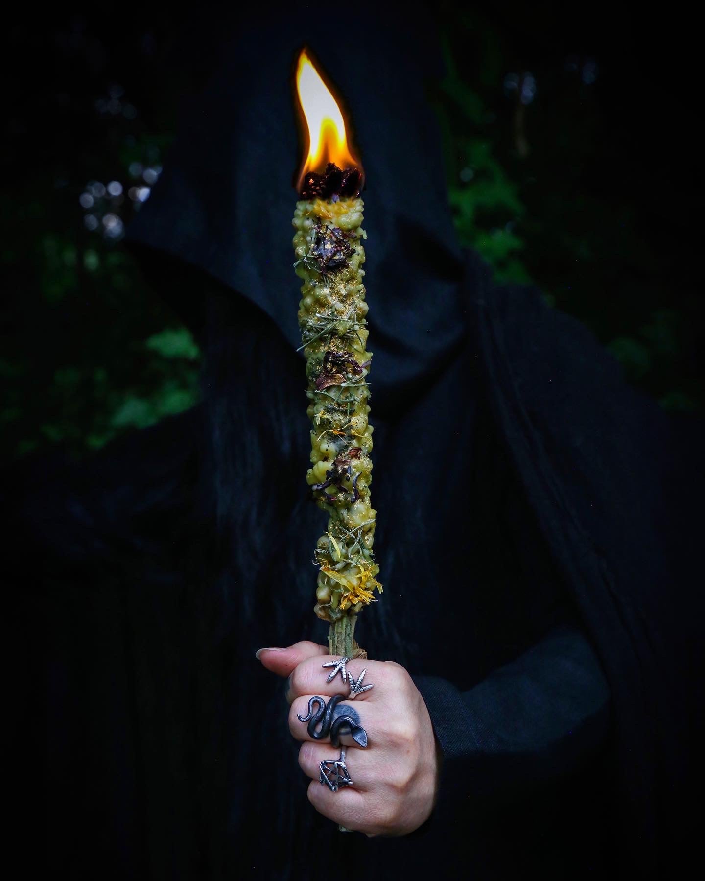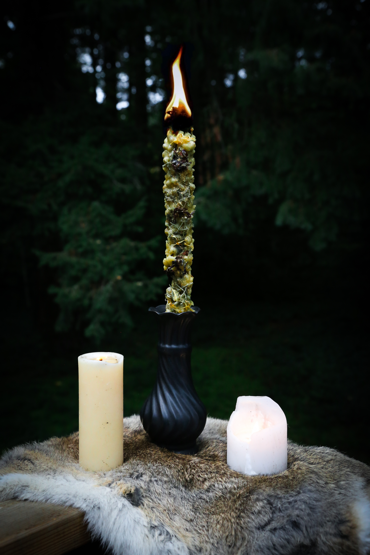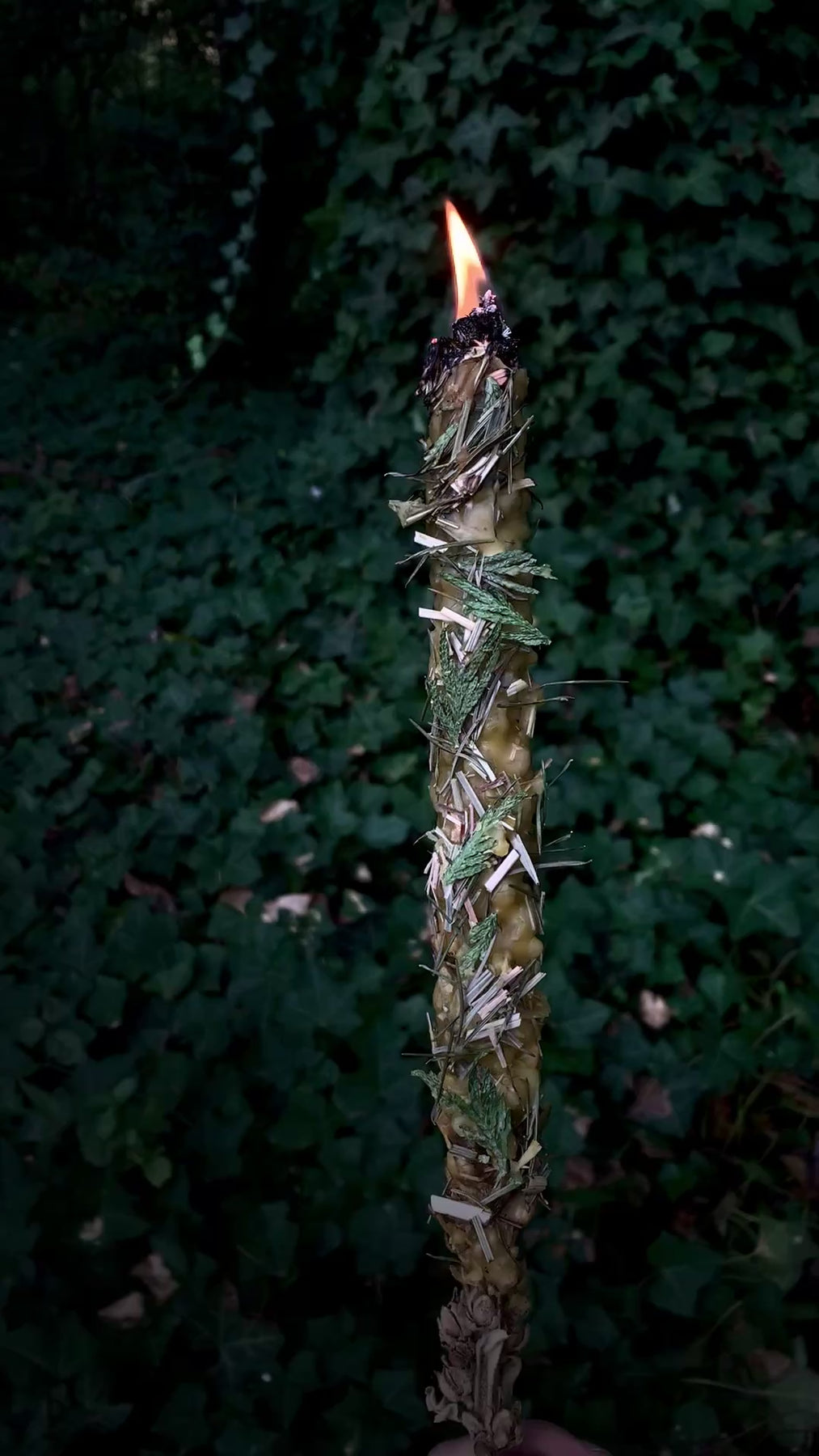 This is for outside use only. Set this Hag Candle on a steady surface and be sure it is far away from anything flammable. You may choose to remove some or all of the adorning herbs to further prevent a risk for sparks. The herbs may crackle and spark. The beeswax will melt down and around the torch as it burns, so be sure it is on a protected surface and do not leave unattended. Once lit, it will likely not go out and it may smoke a lot, so it is recommended to use outdoors or in a well-ventilated open spaces. May be snuffed out into a can of ashes or water and re-lit for later use. Please keep away from children and animals. Keep in mind this is a highly flammable torch so please burn it wisely and take precaution!