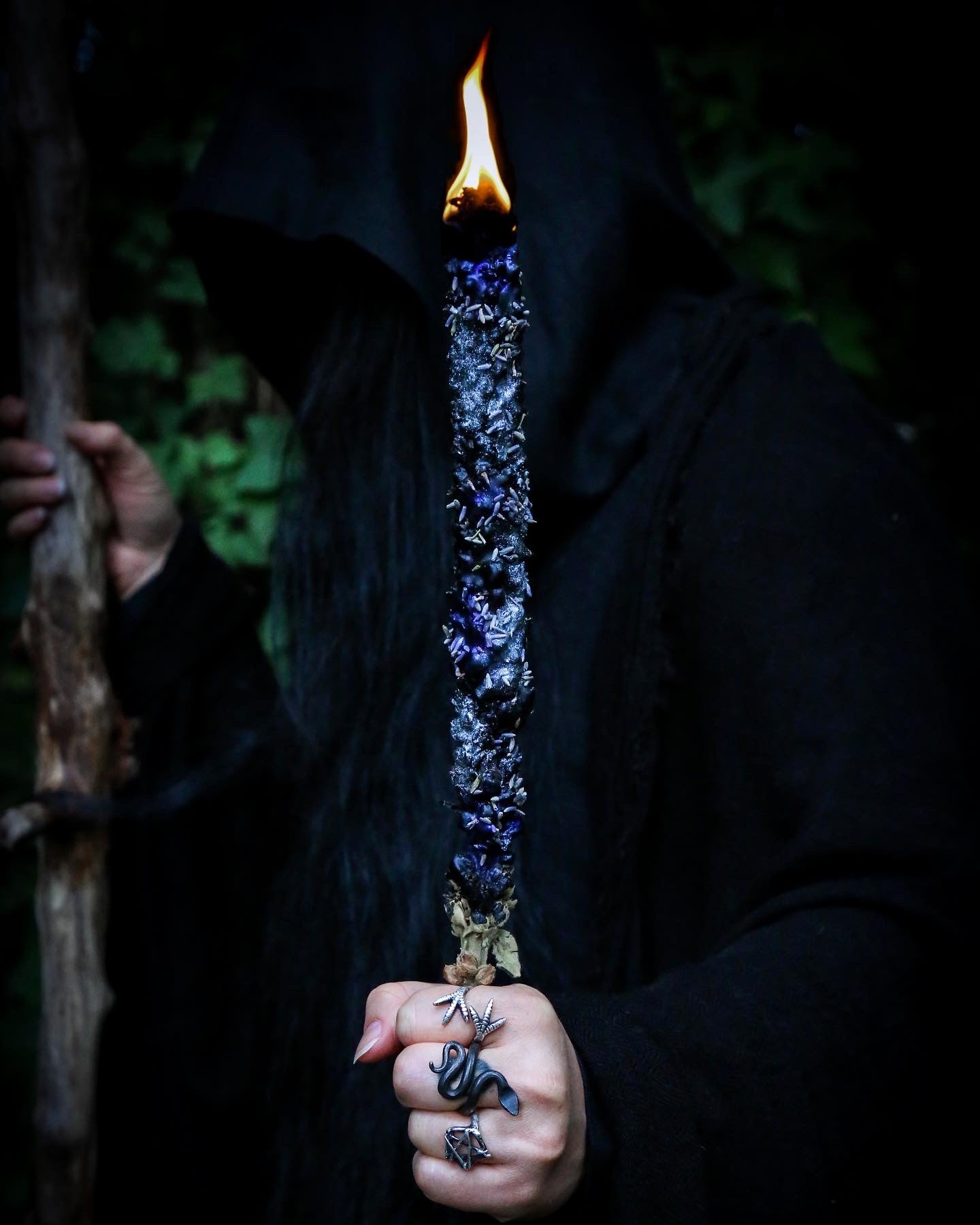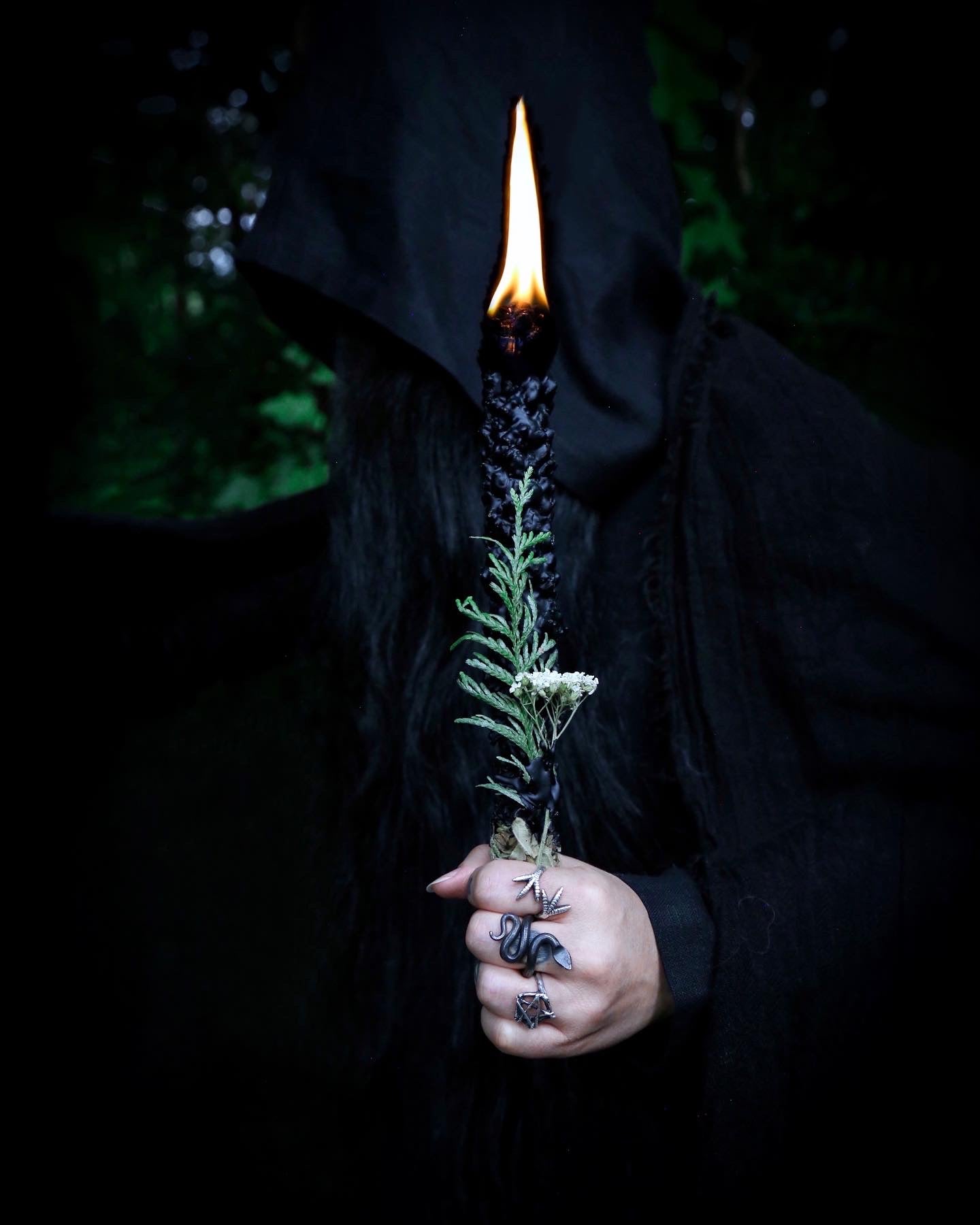 I was so blessed to be able to procure a Rays of Light hag taper. While the veil was thin, I was able to take mine deep into the Olympic mountains in Washington, on a lovely rainy pacific northwest evening. The mist was rolling through the mountains, which I was able to view from a rock overhang where I safely set up my taper. There, I meditated and connected with the forest. I paired it with a couple drops of "into the underworld" , and began to journey back and connect with my ancestors, welcoming them to join me by the light of the taper in this fiercely wild and magical place. The tonic and the taper helped me reforge that deep connection that I had missed for so long.