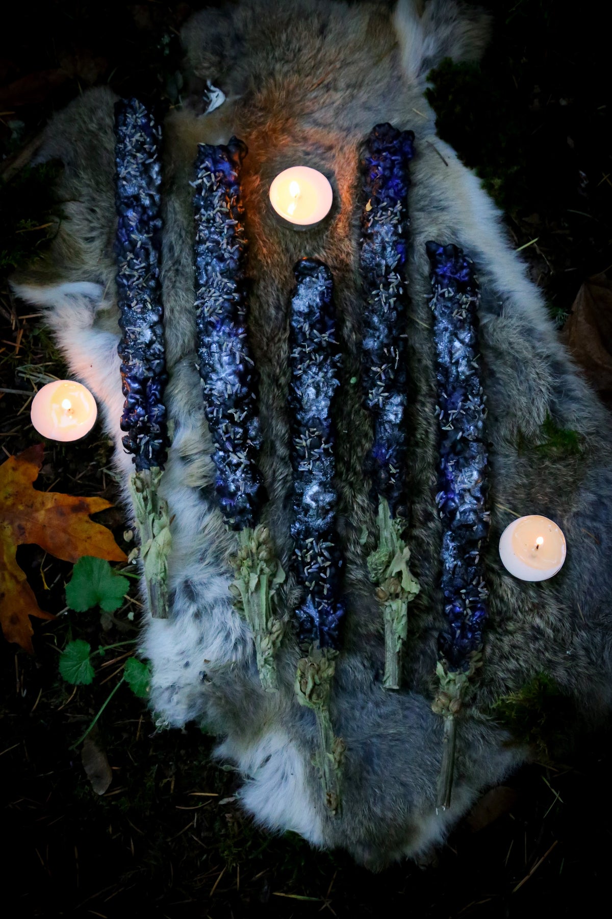 2. Autumn Night Taper - crafted with charcoal infused PNW beeswax, lavender buds & purple/silver mica. Intended to aid in visions & shadow work.