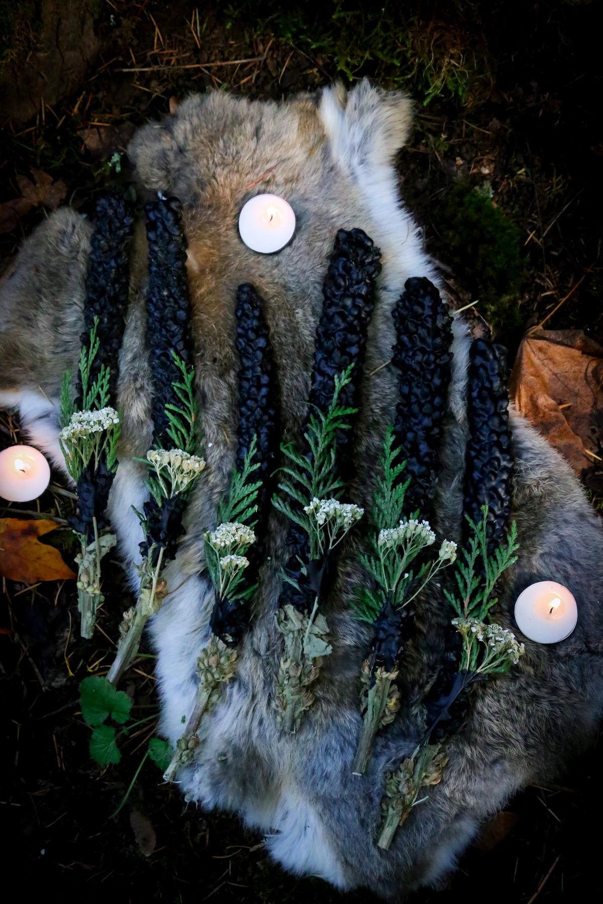 3. Dark Woods Taper - crafted with charcoal infused PNW beeswax, WR Cedar and Yarrow sprig. Intended to conjure protection